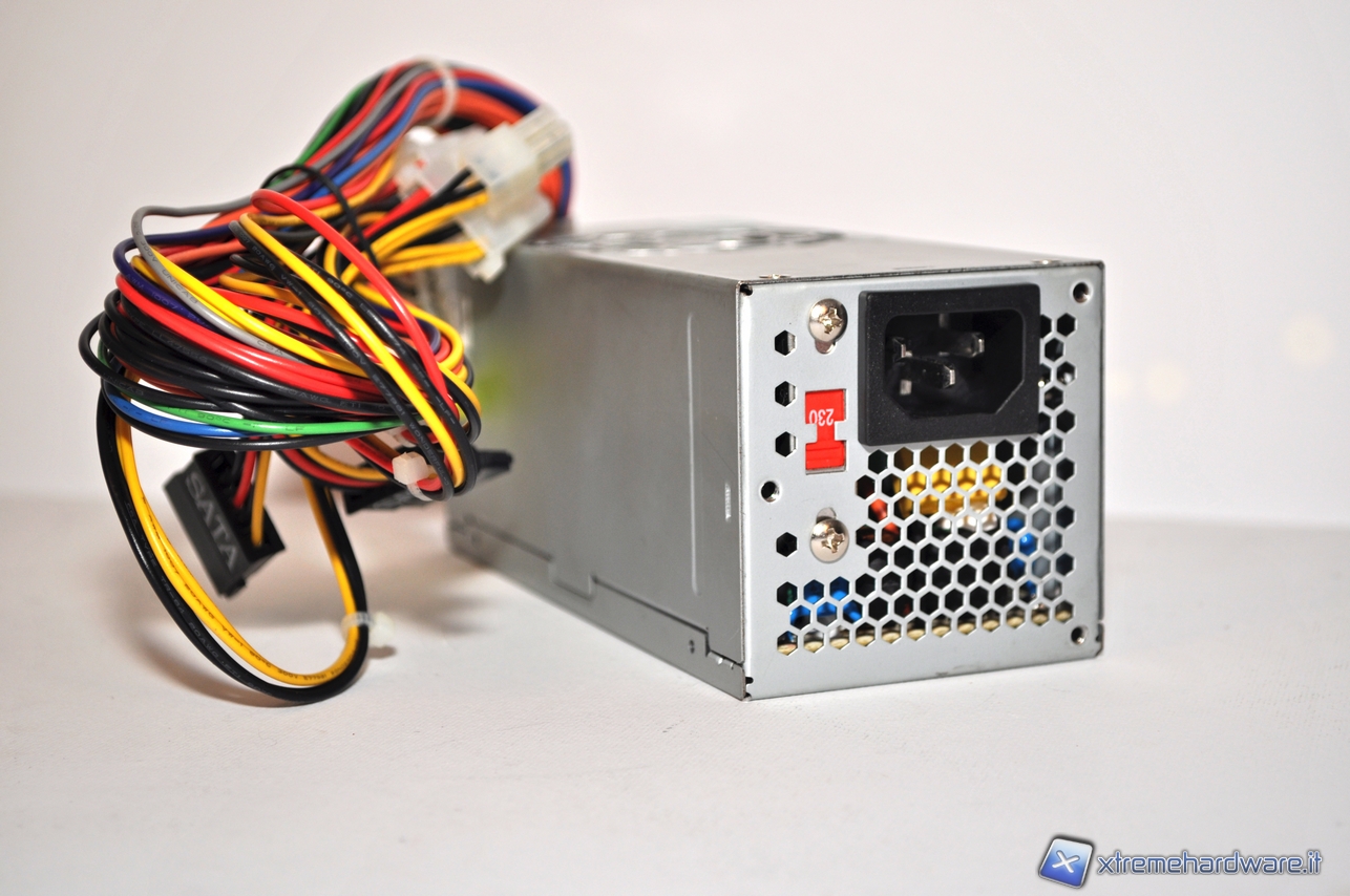 L’alimentatore integrato è sempre della stessa Itek in grado di fornire circa 200W in output con gli amperaggi indicati nell’etichetta sovrastante. L’alimentatore non è di ottima fattura ma comunque più che sufficiente ad alimentare l’intero sistema HTPC. Per altri utilizzi questo alimentatore potrebbe risultare insufficiente, d’altra parte l’obiettivo principale di Itek è stato di ridurne le dimensioni rispetto ad uno con standard ATX. Notiamo inoltre uno switch 230V-110V che ci fa supporre l’utilizzo di un PFC di tipo passivo.